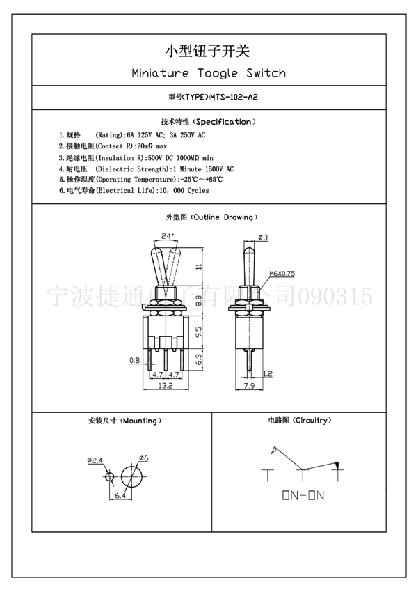 Pin toggle switch; 3-position (ON)-OFF-(ON); SPDT; 15.0 x 29.4mm; pin connection; round metal lever; 16A/250V; IP67; UL 61058-1.